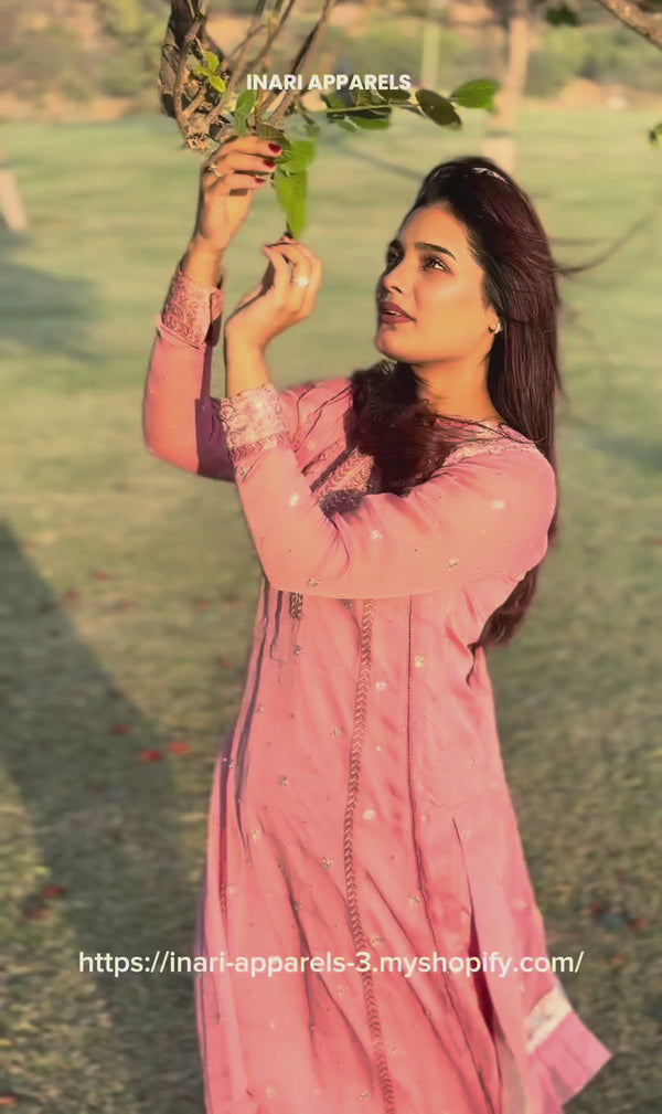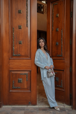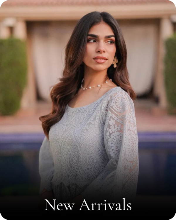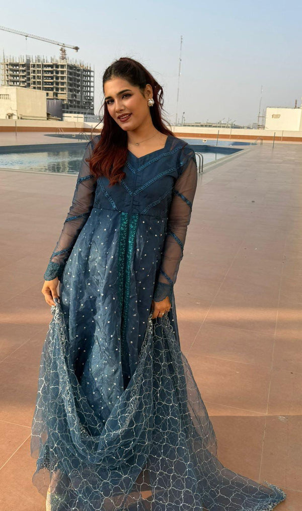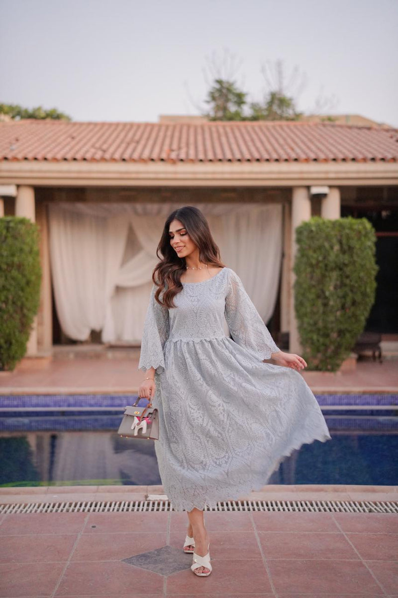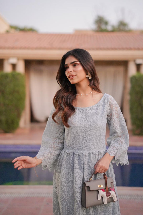 A graceful long frock crafted from delicate, self-embroidered net lace in a serene powder blue shade. This dress features a modest, round neckline and elegant, three-quarter bell sleeves. The silhouette is relaxed and flowing, with a fitted bodice that transitions into a beautifully gathered skirt, hitting around mid-calf.