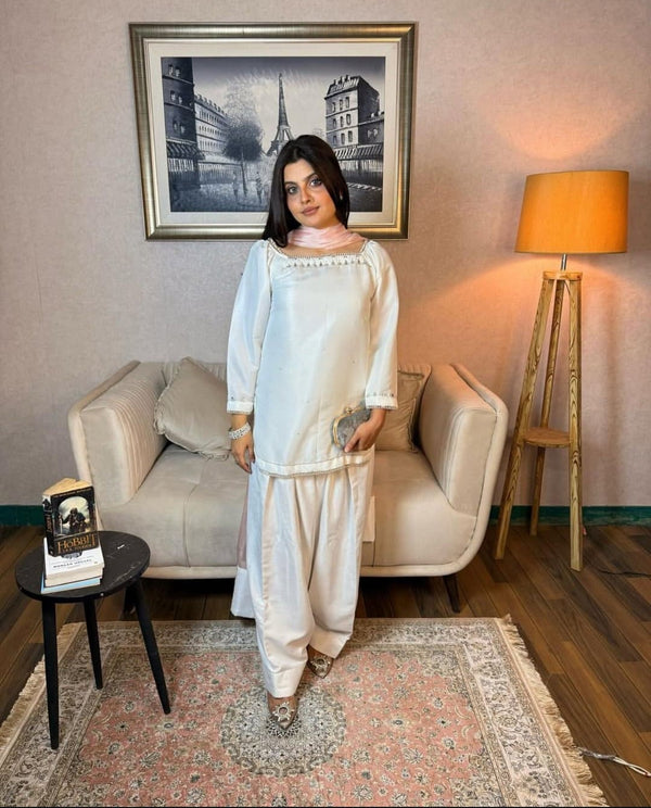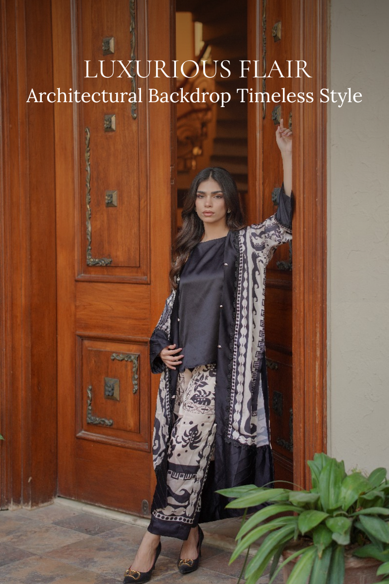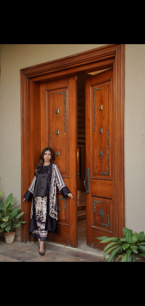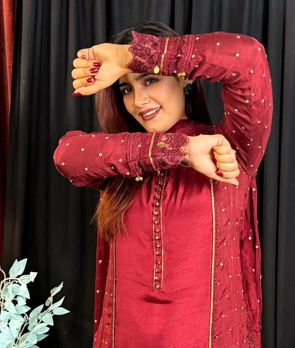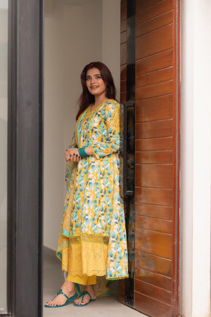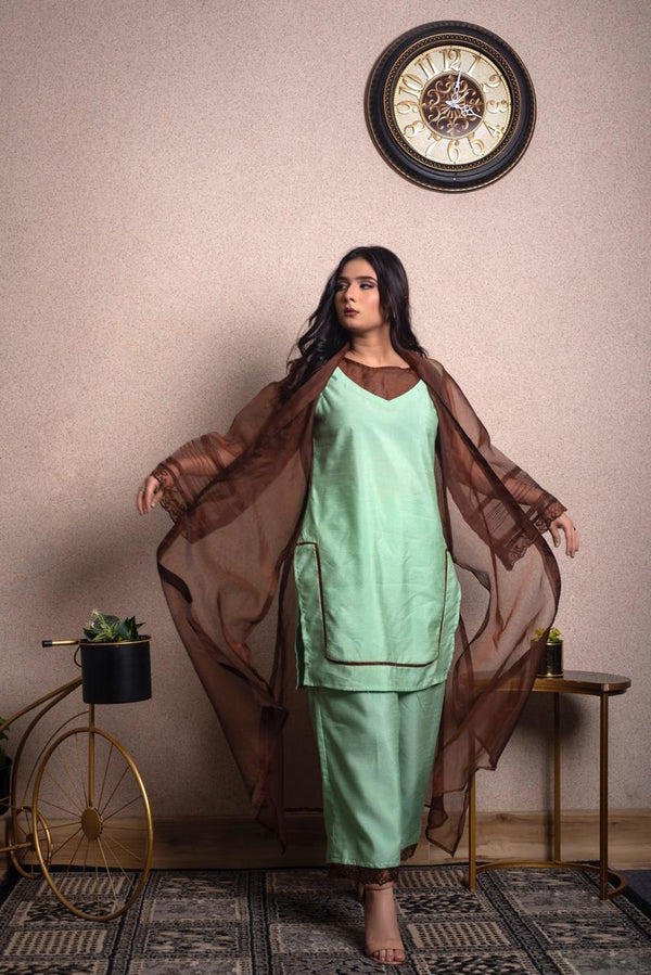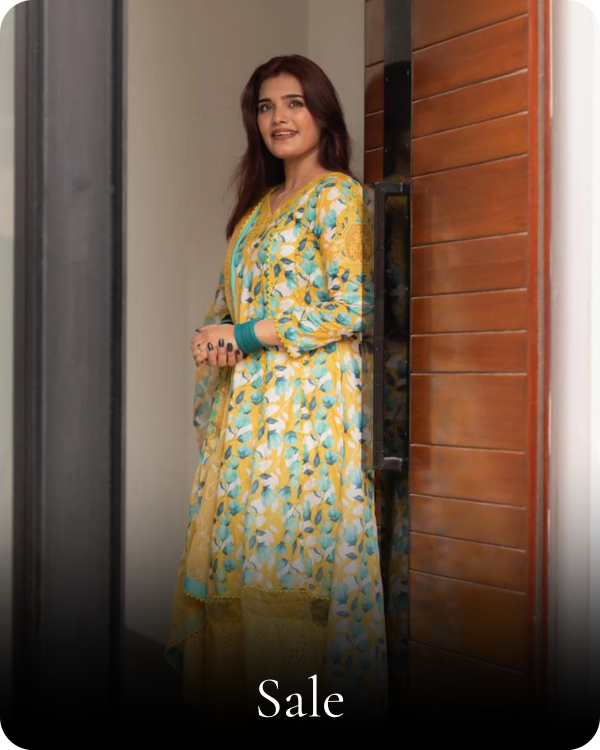 A graceful long frock crafted from delicate, self-embroidered net lace in a serene powder blue shade. This dress features a modest, round neckline and elegant, three-quarter bell sleeves. The silhouette is relaxed and flowing, with a fitted bodice that transitions into a beautifully gathered skirt, hitting around mid-calf.